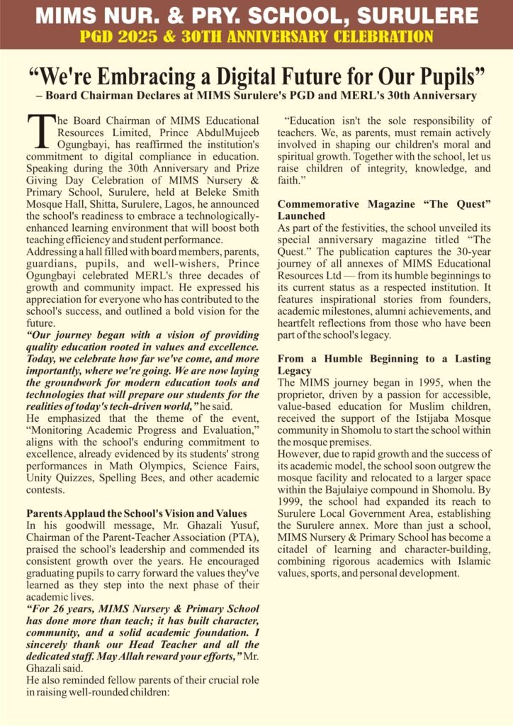 The 2025 MIMS Prize Giving Day (PGD) shall serve as the closing ceremony for the 30th Anniversary. Before then, series of programmes will be held in the school and virtual programme by the Alumni will mark the climax of the events.
