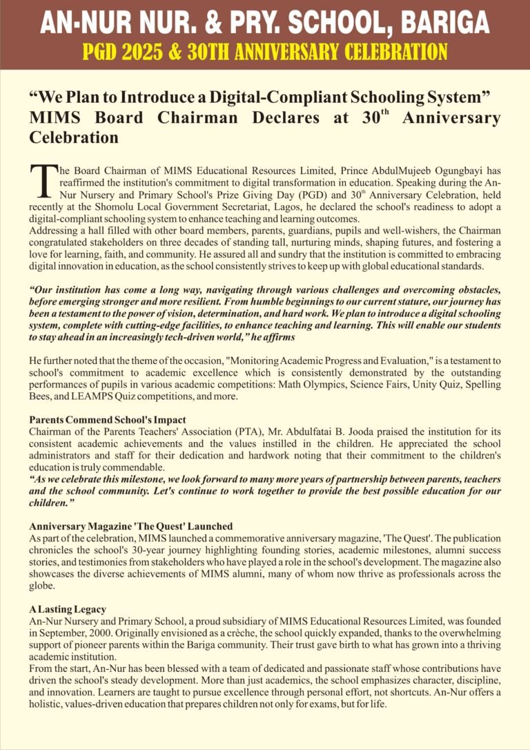 The Board Chairman further added that MIMS 30th Anniversary is a remarkable milestone which shows three decades of excellence, innovation, dedication, and resilience in shaping young minds who are not only future leaders of their immediate environment but also world class leaders.